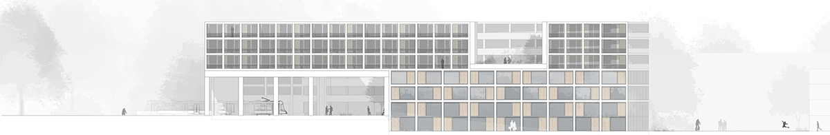 The neighbourhood building is the most important building in the design and marks the entrance to the city. The lower. 4 floors consist of two large L-volumes, which form an open space in the middle. This connects the integrated bus stop with the rest of the neighbourhood. These floors contain shopping, working and event areas. The upper 3 floors accommodate student housing and also form 2 L-shaped volumes, which are, however, mirrored along the central axis.