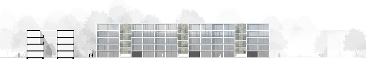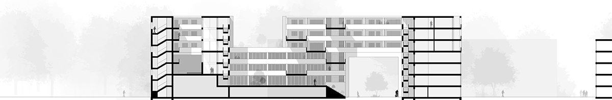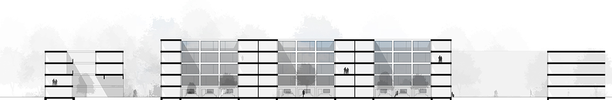 The spaces in between in the urban structure are treated differently. The courtyards to the south, with their reference to the forest, are to serve as "private", park-like recreational areas, just like the green spaces indicated to the north. The other spaces in between, on the other hand, are intended to be semi-public or public areas for people to spend time in, for café seating, events, etc. The Meander is divided into two buildings. The meander is defined by two building depths, which are filled with different typologies. In the 15-metre-deep sections, flats are accessed via arcades. In the 20-metre-deep sections, flats are grouped around low courtyards, each with a staircase. Together with the head, there are thus a total of 4 typologies. Arcade, courtyard, atrium, head (neighbourhood building)